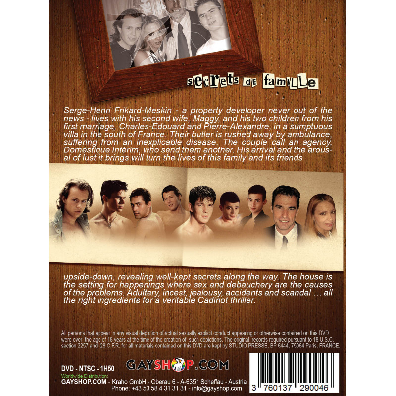 Serge-Henri Frikard-Meskin - a property developer never out of the news - lives with his second wife, Maggy, and his two children from his first marriage, Charles-Edouard and Pierre-Alexandre, in a sumptuous villa in the south of France. Their butler is rushed away by ambulance, suffering from an inexplicable disease. The couple call an agency, Domestique Intérim, who send them another. His arrival and the arousal of lust it brings will turn the lives of this family and its friends upside-down, revealing well-kept secrets along the way. The house is the setting for happenings where sex and debauchery are the causes of the problems. Adultery, incest, jealousy, accidents and scandal … all the right ingredients for a veritable Cadinot thriller.Serge-Henri Frikard-Meskin - ein sehr bekannter Bauunternehmer - lebt mit seiner zweiten Frau, Maggy, und seinen beiden Söhnen aus erster Ehe, Charles-Edouard und Pierre-Alexandre, in einer prächtigen Villa im Süden von Frankreich. Ihr Butler wird gerade mit dem Krankenwagen weggebracht, er leidet an einer unerklärlichen Krankheit. Das Paar ruft bei einer Agentur für Hausangestellte an, um ihnen einen Ersatz zu schicken. Die Ankunft des neuen, dauergeilen Butlers und die damit einhergehende Erregung aller, wird das Leben der Familie und seiner Freunde auf den Kopf stellen und gut gehütete Geheimnisse enthüllen... Das Haus ist der Ort, wo alles passiert, wo Sex und Ausschweifungen zu Ursachen von Problemen werden. Ehebruch, Inzest, Eifersucht, Unfälle und Skandale... genau die richtigen Zutaten für einen echten Cadinot Thriller!Serge-Henri Frikard-Meskin - ein sehr bekannter Bauunternehmer - lebt mit seiner zweiten Frau, Maggy, und seinen beiden Söhnen aus erster Ehe, Charles-Edouard und Pierre-Alexandre, in einer prächtigen Villa im Süden von Frankreich. Ihr Butler wird gerade mit dem Krankenwagen weggebracht, er leidet an einer unerklärlichen Krankheit. Das Paar ruft bei einer Agentur für Hausangestellte an, um ihnen einen Ersatz zu schicken. Die Ankunft des neuen, dauergeilen Butlers und die damit einhergehende Erregung aller, wird das Leben der Familie und seiner Freunde auf den Kopf stellen und gut gehütete Geheimnisse enthüllen... Das Haus ist der Ort, wo alles passiert, wo Sex und Ausschweifungen zu Ursachen von Problemen werden. Ehebruch, Inzest, Eifersucht, Unfälle und Skandale... genau die richtigen Zutaten für einen echten Cadinot Thriller!Serge-Henri Frikard-Meskin - un entrepreneur très connu - vit avec sa deuxième femme, Maggy, et ses deux fils du premier mariage, Charles-Edouard et Pierre-Alexandre, dans une villa somptueuse dans le sud de la France. Le majordome est transporté en ambulance, il souffre d'une maladie inexplicable. Le couple téléphone auprès d'une agence pour employés de maison pour se faire envoyer un remplaçant. L'arrivée du nouveau majordome excité en permanence et l'excitation de tous qui s'en suit, vont bouleverser la vie de la famille et de ses amis et dévoiler des secrets bien gardés ... La maison est l'endroit où tout se déroule, où le sexe et les excès sont à l'origine des problèmes. L'adultère, l'inceste, la jalousie, des accidents et des scandales ... ce sont les bons ingrédients pour un vrai thriller à la Cadinot!Serge-Henri Frikard-Meskin - es un famoso empresario de la construcción - vive con su segunda mujer, Maggy y sus dos hijos del primer matrimonio Charles-Edouard und Pierre-Alexandre en una gran villa al sur de Francia. Su mayordomo es llevado de urgencias en una ambulancia debido a una enfermedad inexplicable. La pareja llama a una agencia de serviciós domésticos para pedir un reemplazo. La llegada del nuevo mayordomo y su excitación permanente cambiará la vida de la familia y revelará grandes secretos... La casa es el lugar donde todo pasa, donde el sexo y los exceso son las causas de los problemas. Infidelidad, incesto, celos, accidentes y escándalos... exactamente los ingredientes perfectos para una película de suspenso de Cadinot! Dorian Valmont, Martin Berne, Harvey Whistle, Mario Cavalieri, Maximilien Kobs, Haythem Nidal, Sylvain Paka, Casimir Rich, Kamel Mehadi -francais--eigenware- Jean-Daniel Cadinot Studio Cadinot DVDs & Medien DVDs Klassiker Nationalitäten / Ethnische Gruppen Franzosen Twinks (18-22) Männer Exklusive DVDs