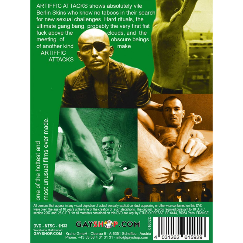 Cazzo Cult Factor: It was once again possible for the director to convince numerous participants and actors from his circle of friends to work for this extensive co-production on a volunteer basis. The result is an amazingly artistic film, which features unusual figures and startling colors, and has a simple, but in no way implausible background story. It enriches the gay, hard- core porn market with a truly innovative component. And the name says it all: ARTIFFIC ATTACKS – Artistic Attacks...ARTIFFIC ATTACKS shows absolutely vile Berlin Skins who know no taboos in their search for new sexual challenges. Hard rituals, the ultimate gang bang, probably the very first fist fuck above the clouds, and the meeting of obscure beings of another kind make ARTIFFIC ATTACKS one of the hottest and most unusual films ever made.Aus der ungewöhnlichen Berliner SM-Reihe nach AUTHENTIC ADVENTURES, ORIGINAL OPTIONS und DEVIANT DETOURS jetzt eine neue Attacke auf den Begriff des Hardcore Pornos.